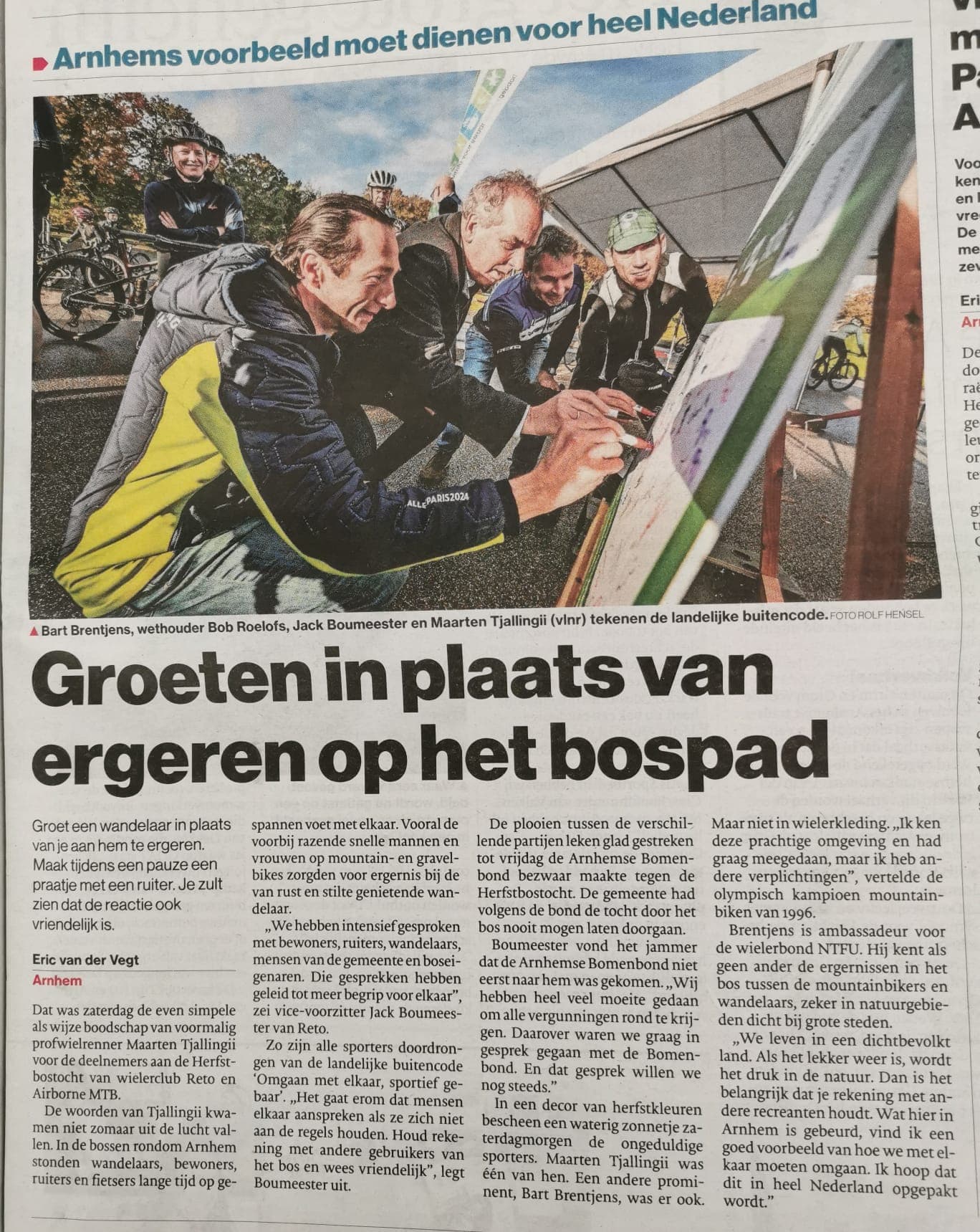 De ArnhemseBosFietsCoalitie heeft afgelopen jaar in goed overleg met de gemeente Arnhem, boswachters, de bewoners, natuur-belangenbehartigers, manegehouders & ruiters en wandelaars in en rondom Schaarsbergen een werkbare oplossing gevonden om het bosfietsen, wandelen en paardrijden samen te reguleren. Zodat vele bospaden openblijven voor bosfietsers en onze toertochten door dit unieke natuurgebied kunnen blijven plaatsvinden. Afgelopen zaterdag hebben we met gemeente Arnhem, wielerbond NTFU, alle betrokkenen Γ©n bijzondere gasten een extra statement gemaakt.